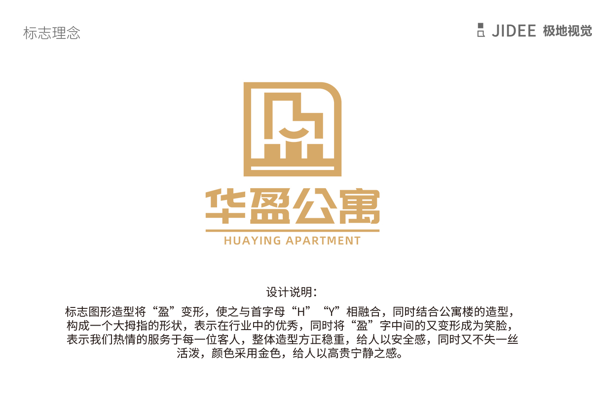 品牌介紹 :華盈公寓logo設(shè)計(jì),標(biāo)志圖形造型將“盈”變形,使之與首字母“H”“Y”相融合,同時(shí)結(jié)合公寓樓的造型,構(gòu)成一個(gè)大拇指的形狀,表示在行業(yè)中的優(yōu)秀,同時(shí)將“盈”字中間的又變形成為笑臉,表示我們熱情的服務(wù)于每一位客人,整體造型方正穩(wěn)重,給人以安全感,同時(shí)又不失一絲活潑,顏色采用金色,給人以高貴寧靜之感。