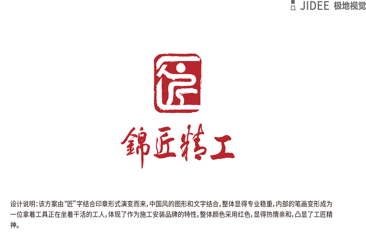 品牌介紹 :該logo設(shè)計方案由“匠”字結(jié)合印章形式演變而來,中國風(fēng)的圖形和文字結(jié)合,整體顯得專業(yè)穩(wěn)重,內(nèi)部的筆畫變換成為一位拿著工具正在坐著干活的工人,體現(xiàn)了作為施工安裝品牌的特性,整體顏色采用紅色,顯得熱情親和,凸顯了工匠精神,是中國風(fēng)的標(biāo)志。