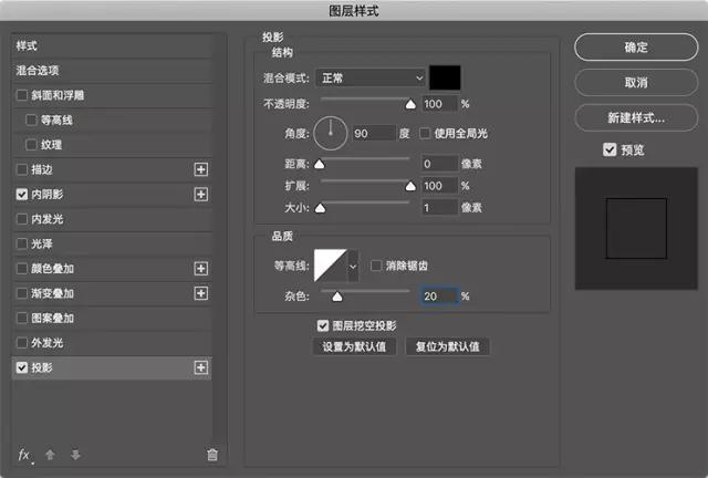 將智能對象圖層的填充不透明度設置為0,添加一個內陰影樣式設置如下。還要創建一個投影,只有1px的大小。這兩個陰影一起形成具有粗糙邊緣的筆畫/輪廓效果。