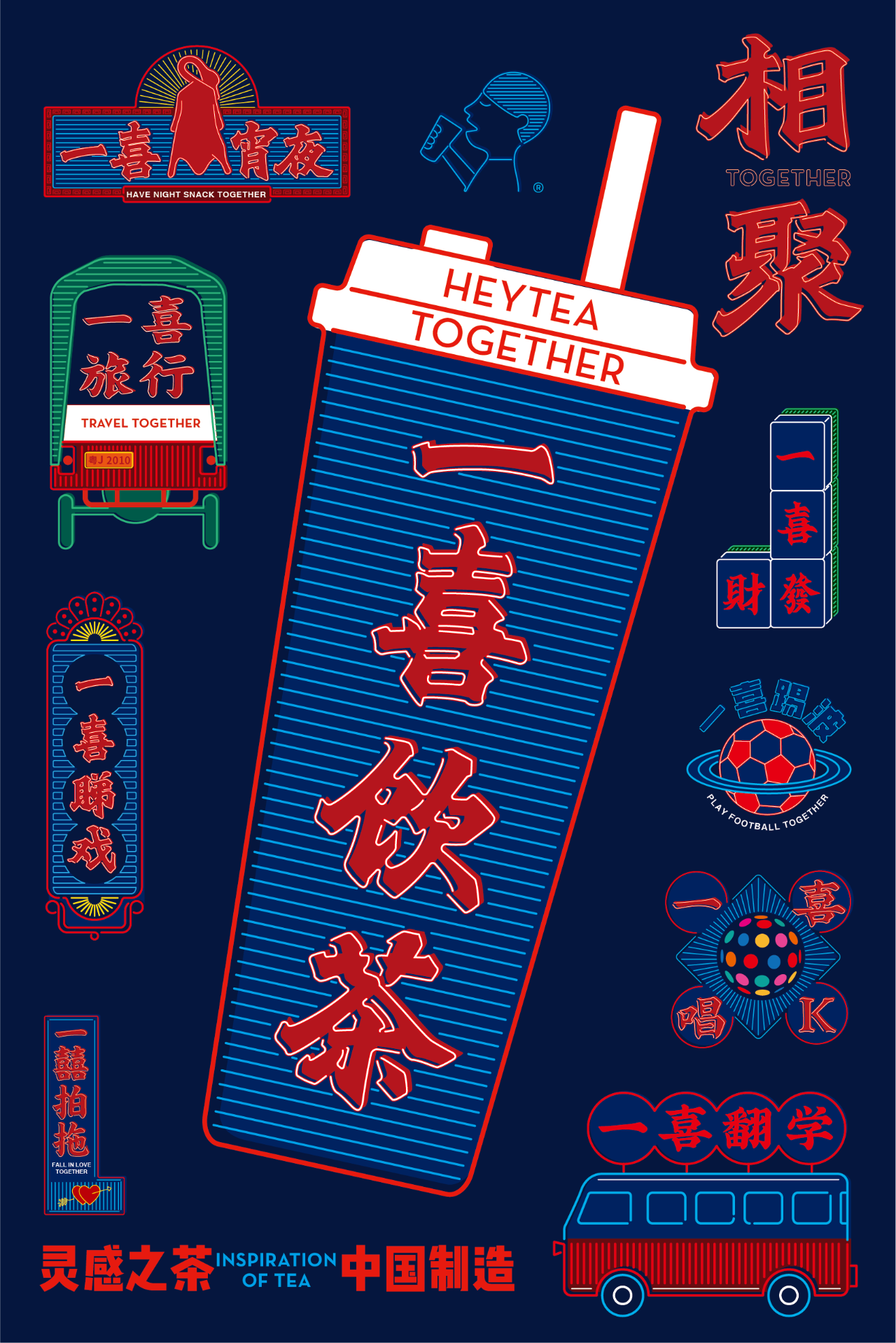 喜茶,一個(gè)被奶茶事業(yè)耽誤的設(shè)計(jì)公司,胡子,一個(gè)為五條人打造靈魂海報(bào)的設(shè)計(jì)師,同樣是誕生于廣東獨(dú)有的文化之下,這兩者相遇,會(huì)迸發(fā)出怎樣的火花呢?一喜行街主題海報(bào):海報(bào)延續(xù)了喜茶一貫的風(fēng)格,紅與藍(lán)的配色打造復(fù)古、簡(jiǎn)約的意象,而“人字拖”、“牌匾”等元素,是五條人海報(bào)最常用到的東西,海報(bào)排版也似五條人海報(bào)一樣隨性。海報(bào)文案的粵語諧音也非常有趣:一喜睇(dì)戲、、一喜唱K、一喜發(fā)財(cái)、一喜飲茶、一喜宵夜、一喜旅行,體現(xiàn)了年輕人自由灑脫的生活態(tài)度。如果說上面兩幅海報(bào)代表 “白天”,那么下面這兩幅 “霓虹” 版的海報(bào)就帶我們開啟了 “夜晚” 模式。同樣的設(shè)計(jì),因?yàn)轭伾牟煌o觀眾的感覺也截然不同。喜茶的手提袋與奶茶杯一直都是他們的品牌亮點(diǎn),將全新的設(shè)計(jì)融入包裝上面,再次展現(xiàn)了喜茶品牌設(shè)計(jì)的多元化。精致、小資的喜茶門店視覺,結(jié)合“紅白藍(lán)編織袋”背景墻,折疊桌、紅藍(lán)塑料凳等大排檔元素,這波反差,真是令人大開眼界這樣聲勢(shì)浩大的跨界。