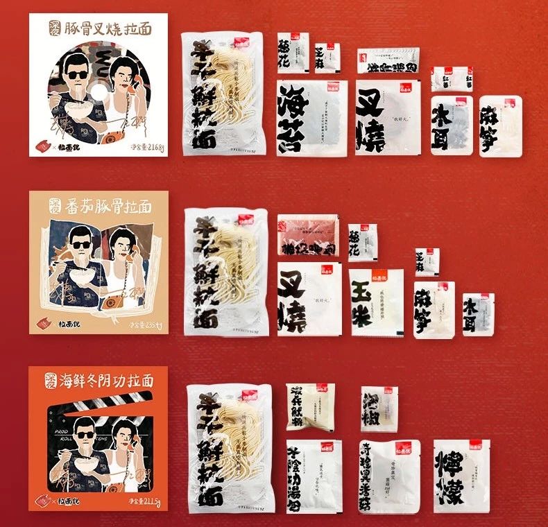 五條人和拉面說的聯(lián)名,設(shè)計(jì)依舊土潮土潮的。看這背景滿滿復(fù)古懷舊感的宣傳海報(bào),一看就很“五條人”!包裝設(shè)計(jì)也是土潮土潮,包裝通過復(fù)古配色的漫畫形式呈現(xiàn)了樂隊(duì)成員茂濤在吃面和穿著白背心的仁科在打電話的場(chǎng)景,借用了五條人喜歡打電話的梗。而三款不同口味的包裝,用音、影、書的概念來設(shè)計(jì)。分別以“光盤”、“場(chǎng)記板”和“書”作為框架元素,增加了趣味。打開包裝,里面除了泡面教程以外還附上一句“土味情話”,比如以下這句:“阿面愛上阿條,在一個(gè)睡不著的夜晚。”有多少人看著文案不禁哼出來的。除此之外,宣傳海報(bào)的設(shè)計(jì),也是非常地接地氣,海報(bào)整體采用了具懷舊感的色調(diào),主體為這次聯(lián)名款的新包裝和冒著熱氣的實(shí)物拉面為主,而背景則采用舊風(fēng)扇、舊電視機(jī)、收音機(jī)等具有年代感的物品渲染氣氛。可以說,當(dāng)接地氣的五條人和具煙火氣的拉面說結(jié)合,兩者的氣質(zhì)非常地融洽了。