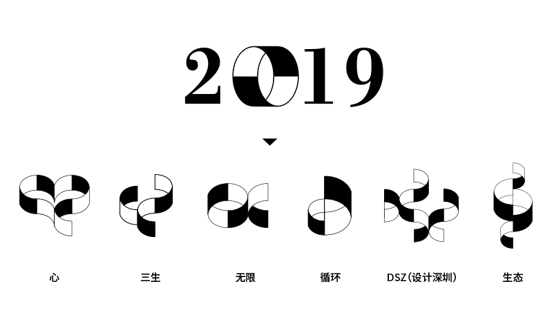 主視覺設(shè)計借用“可持續(xù)”的概念,從設(shè)計元素的可持續(xù)出發(fā),從年份“2019”中提取“0”,設(shè)計了一套專屬字體,并在字體的基礎(chǔ)上設(shè)計了一組圖標,代表著不同的寓意。