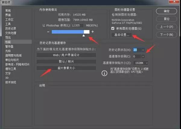 歷史記錄與高速緩存我選的是第三個選項,超大像素大小,這種情況適合于大像素圖層少的圖片類型編輯,基本上就是為攝影后期準(zhǔn)備的。選定超大像素大小以后,右邊的高速緩存級別和高速緩存拼貼大小會自動設(shè)定好。