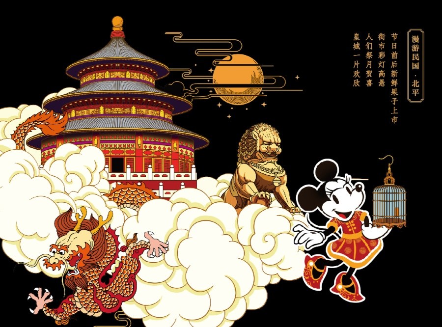 在“Mickey漫游民國”的主題下,RLON用畫筆,將北京的皇城味、上海灘紙醉金迷的都市味兒、廣府美食獨有的思鄉味兒和昆明云貴高原物產的風味,一樣樣畫下來,美輪美奐且“最有范”的迪士尼民國范月餅包裝設計完美呈現。