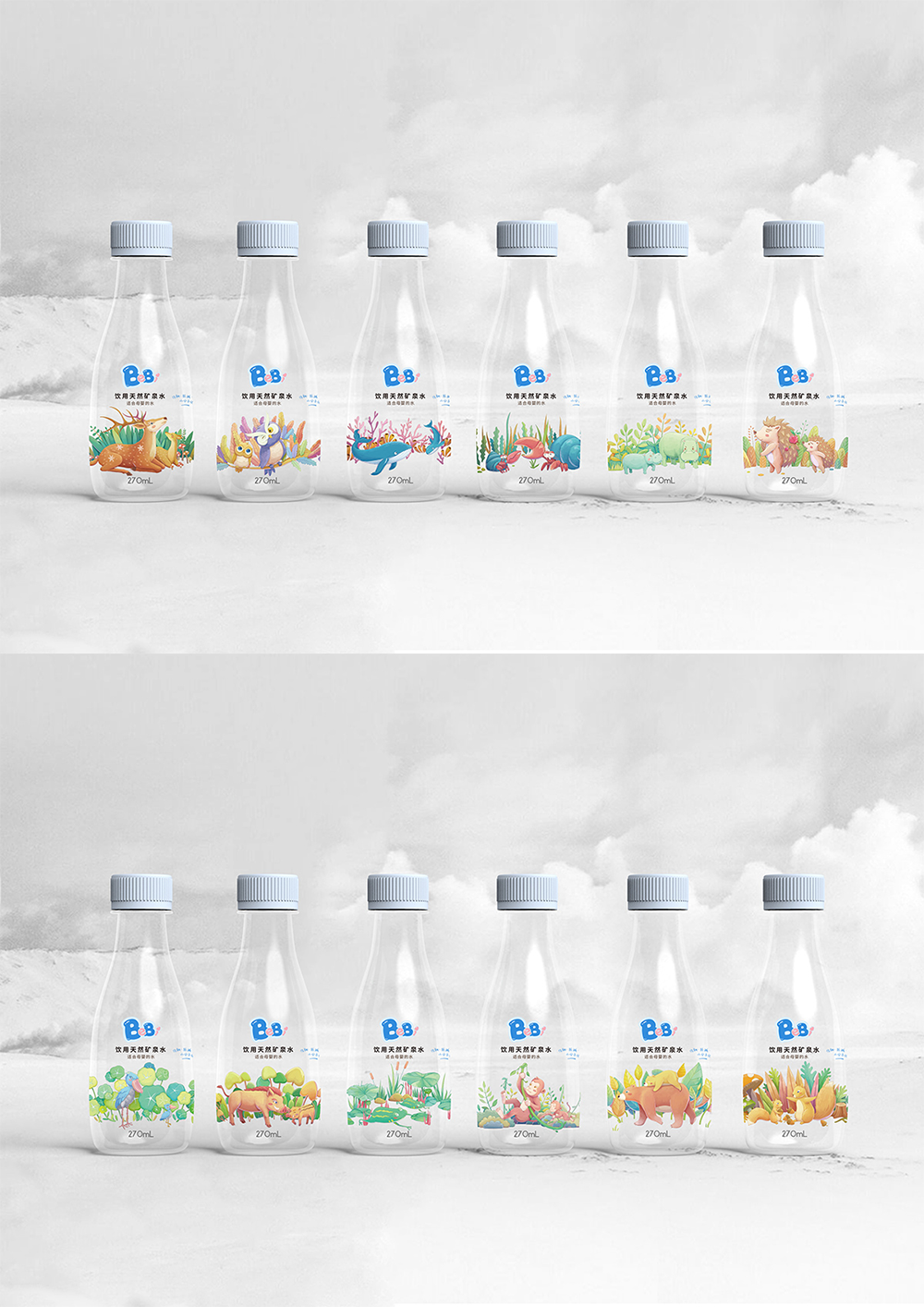 設(shè)計(jì)團(tuán)隊(duì)用12幅插畫來秉承愛的理念,溫暖呵護(hù)著媽媽和寶貝,拉近親子關(guān)系。為了照顧媽媽需要給寶寶沖調(diào)奶粉的需求,包裝使用了小瓶裝,一次飲用減少污染,兒童也方便攜帶,使媽媽寶寶用水更加放心、安心。