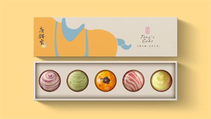 于2002年創立的唐餅家中式糕點品牌,這次的包裝形象升級以簡潔的設計手法和國潮風格,結合唐朝代表性的宮廷或官家元素,演繹了全新的唐朝韻味。首先包裝以唐朝畫作重現精致唐風,帝后組合作為品牌核心形象,結合唐朝文化藝術中的三彩馬、三彩駱駝及唐朝經典建筑設計。另外通過扁平化色彩,抽象線條的畫面勾勒,巧妙展示了產品特有的外觀形象。整體波普化的呈現形式,契合品牌調性的同時,系列的視覺效果增添了幾分美感。而另一個版本的獨立包裝,莫蘭迪色調背景下以抽象化呈現了食品本身的外觀,激發消費者的味覺聯想。