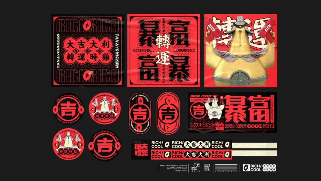 品牌的物料設計中,通過“大吉大利“”運轉時雞“”暴富”等詞語,將這些美好愿景傳遞給消費者。
