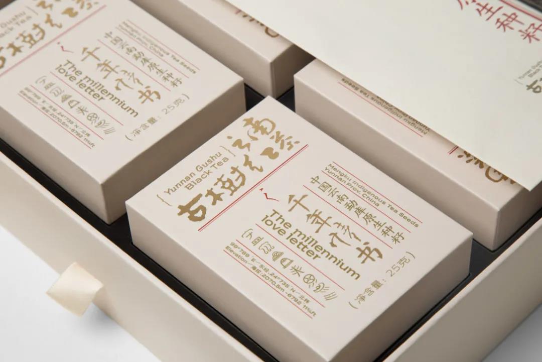 先來看有點浪漫的手工情書系列,原木色的禮盒包裝,奠定了整體歲月靜好般的小資情懷,輔以沉黑色的山景圖腹帶標簽貼,很好地平衡了視覺層次。另外封面還設有古老的漢字書體,重點突出茶葉的產(chǎn)地等信息,呼應了品牌的“手工情書”系列,增強整體的文化底蘊。