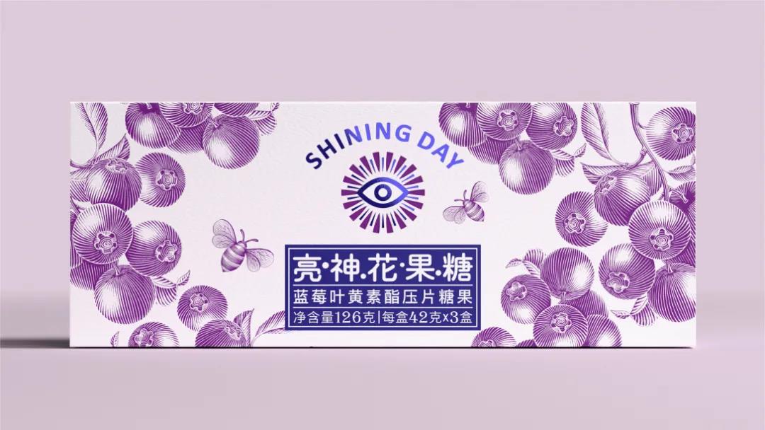 另外手繪插畫的風格,呼應了品牌所要追求的休閑感,并以藍紫雙色調的重疊碰撞,描繪出蜜蜂正在圍繞新鮮藍莓采蜜的畫面,表達出產品的口味特點,對稱式布局盡顯天然美感。抽拉式禮盒設計,節省了用戶開啟禮盒的時間,給予消費者更舒適的感觀體驗。最后產品的slogan,以“嚼一嚼”為視覺語言,激發消費者對產品使用的好奇心理,讓護眼的過程也變得輕松、愉悅。